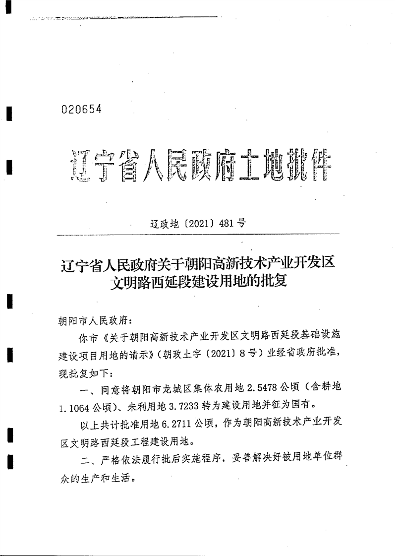 朝阳高新技术产业开发区文明路西延段建设用地的批复