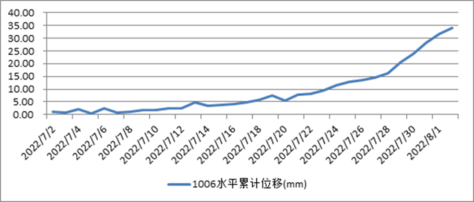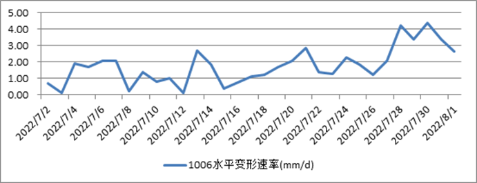 滑坡体中部(1006)水平变形速率2.63mm/d比8月1日3.4mm/d略有减少趋势;垂直变形速率-1.29mm/d比8月1日-1.6mm/d略有减少趋势。